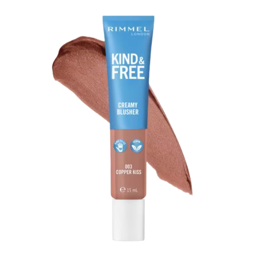 Rimmel Kind & Free Creamy Blusher i nyansen 003 Copper Kiss är en vegansk och parfymfri krämrouge som ger kinderna en naturlig, varm lyster. Den lätta och silkeslena formulan smälter in i huden och lämnar en daggfrisk finish som håller hela dagen. Den byggbara färgen gör det enkelt att anpassa intensiteten, så att du kan skapa allt från en diskret vardagslook till en mer framträdande kvällsmakeup. Med sin praktiska tubförpackning är den perfekt för både hemmabruk och snabba touch-ups när du är på språng. Kind & Free-serien är skapad med omtanke för både dig och miljön och innehåller inga mineraloljor eller animaliska ingredienser.